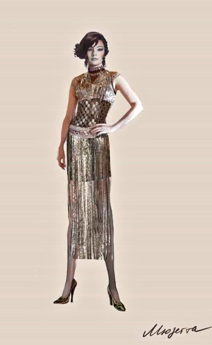 — Более всего — архивными фото: уличными фотографиями, фото с модных показов, даже фотографиями культовых фигур 60-х, 70-х годов. Таких, к примеру, как Серж Гейнсбур, Джейн Биркин, Роман Полански. У меня было такое погружение в эстетику того времени. Но более всего мое внимание привлекло творчества Пако Рабана. Смелое, футуристическое, я бы даже сказала, революционное. Какие-то элементы его стиля отражены в костюмах Мюзетты, а именно в ее платье для сцены в ресторане, а также в костюмах балета, в лифах, напоминающих кольчугу, в пластике, использованном на юбках. Такое смешение материалов, технологичных для того времени, было свойственно стилю Рабана.