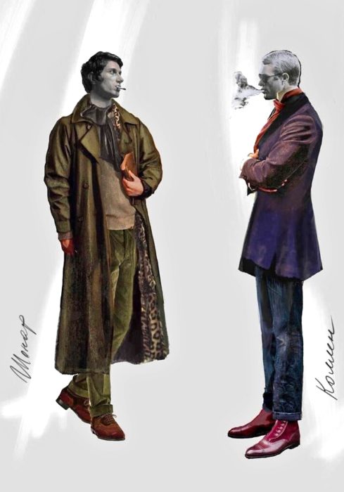 — Время, выбранное режиссером, — конец 60-х — начало 70-х годов XX века. И это время наиболее явно отражено в костюмах главных персонажей. Чистые линии, прямые силуэты, фактуры тканей — все из того времени. Прямые, немного удлиненные пиджаки, шелковый бархат костюма Мими в первом акте, такой отчасти винтажный, — все это было популярно в ту эпоху. Мы сшили для Мими элегантное пальто бежевого оттенка, напоминающее одновременно тренч, находившийся на пике моды как раз с середины 60-х, и винтажное пальто удлиненного силуэта из моды конца 40-х годов. То есть костюм каждого персонажа несет на себе печать его личной истории.