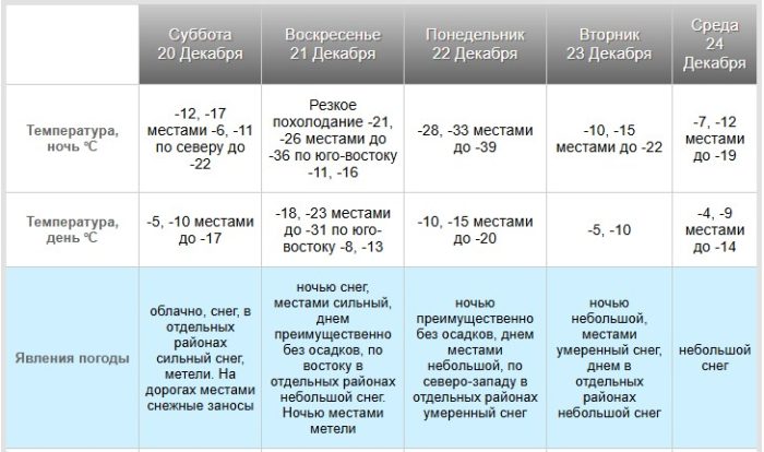 В ночь на воскресенье, 21 декабря, произойдет резкое похолодание до -21…-26, местами до -36. В дневное время суток ожидается -18…-23, местами до -31. Остальные метеоусловия прежние: снег, местами метели, сильный ветер.