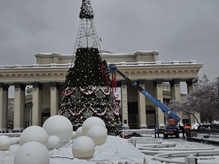 В конце ноября в центре Новосибирска появился каркас новогодней ёлки города и началось украшение театрального сквера. Как рассказали в мэрии, главный символ праздника в 2025—2026 году будет оформлен «в русском стиле».