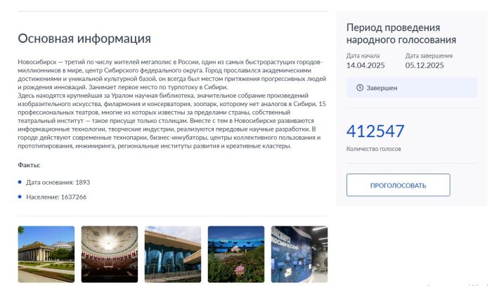 По итогам онлайн-голосования второе и третье места соответственно заняли Челябинск (273 тысячи и 14,39% голосовавших) и Вологда (237 тысяч и 12,5%). Весь период голосования они были очень близки к Новосибирску, но под конец наш город стремительно вырвал первенство. В этой борьбе Новосибирск поддержали 412,5 тысячи человек, что составило 21,75% от общего числа участников. Среди них были выдающиеся новосибирцы, знаменитости, известные артисты, политики и спортсмены: например, волейбольный клуб «Локомотив».