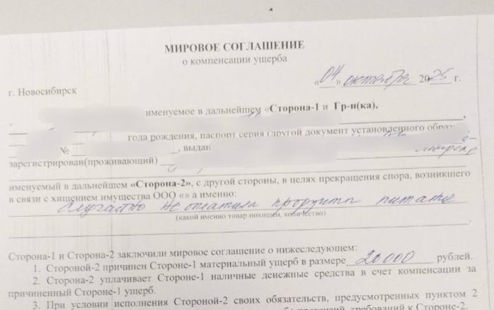 В качестве альтернативы пенсионерке предложили подписать мировое соглашение о компенсации ущерба и заплатить сумму, 10-кратную стоимости украденного — 20 тысяч. У женщины не оказалось нужной суммы наличными, так что её отпустили домой за деньгами. Однако затем в магазине сказали, что соглашение будет подписано в одном экземпляре. Якобы оригинал документа сибирячка может только сфотографировать. После этого пенсионерка написала заявление в полицию.