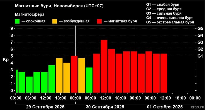 С 30 сентября на 1 октября ситуация только ухудшилась. Уровень магнитной бури варьируется от G1 (слабая буря) до G3 (сильная буря). Улучшение ситуации в ближайшее время не прогнозируется.
