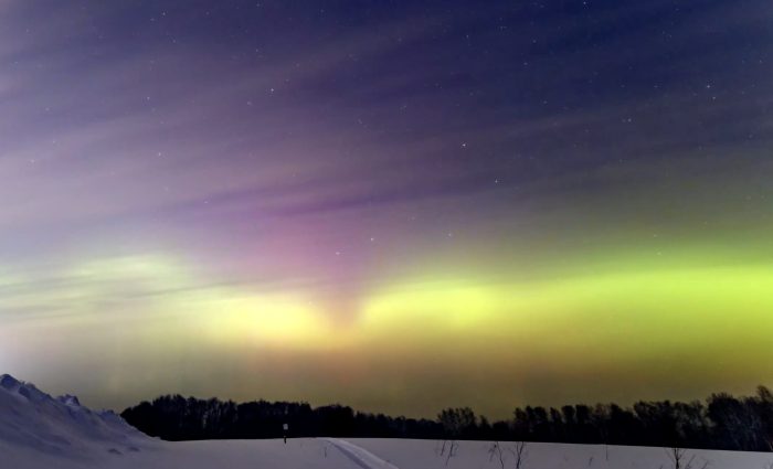 «Снимал примерно в 25 километрах от Новосибирска, в направлении на деревню Жеребцово. Глазом было неплохо видно зеленую часть сияния, но красные столбы удалось наблюдать только в широкоугольный бинокль 3×50», — рассказал Поляков, опубликовав видео-таймлапс с этим примечательным атмосферным явлением в своих соцсетях.