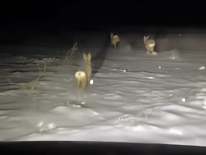На кадрах, опубликованных на странице автора видео, видно, как ночью в заснеженном поле машина преследует несколько косуль. Испуганные животные пытаются уйти от фар и шума мотора.