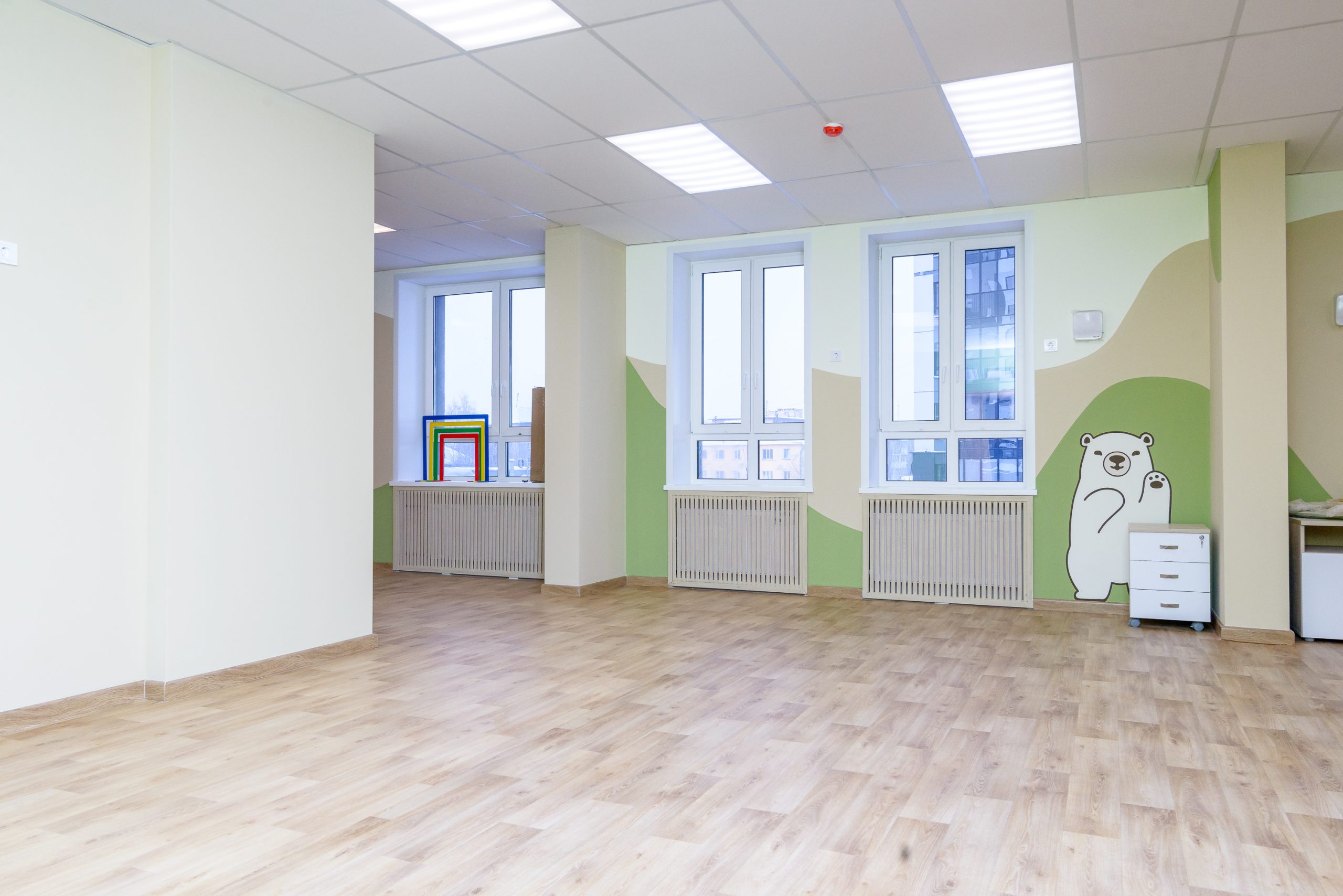 Оформленные забавными медвежатами на стенах четыре комнаты для групп расположены на 2 этаже, а весь первый этаж предназначен для служебных и хозяйственных нужд. Здесь — комнаты для хранения и приготовления продуктов, кухни, прачечной, гладильной, а также для персонала. В здании есть лифт, что для дошкольных учреждений большая редкость.