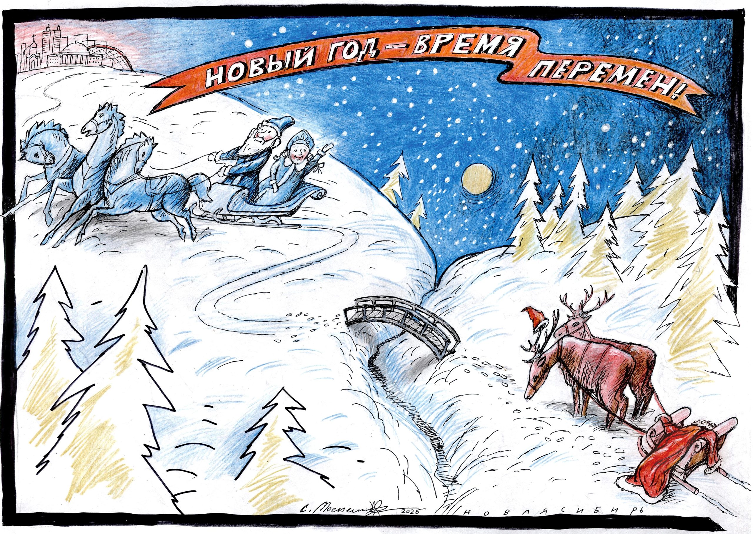 Вступая в Год лошади, несложно проиллюстрировать возвращение к традиционным ценностям, заменив в повозке Деда Мороза оленей на нормальную русскую тройку. Это ведь коней на переправе не меняют, а группу северных оленей на тройку упряжных — запросто.